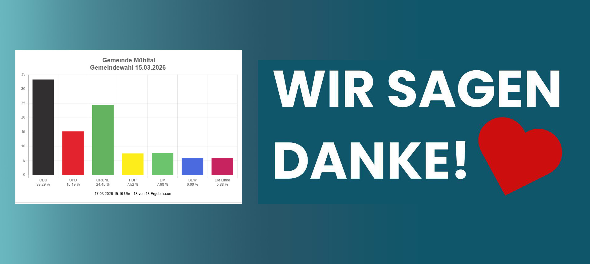 Wir bedanken uns herzlich bei allen Mühltalerinnen und Mühltalern für dieses große Vertrauen bei der Kommunalwahl am 15. März! Das ist nicht selbstverständlich und das wissen wir zu schätzen! Das starke Wahlergebnis ist für uns nicht nur ein Grund zur Freude, sondern vor allem ein klarer Auftrag, unsere Arbeit für Mühltal weiterhin engagiert, verantwortungsvoll und mit Blick auf das Machbare in den nächsten 5 Jahren fortzusetzen.